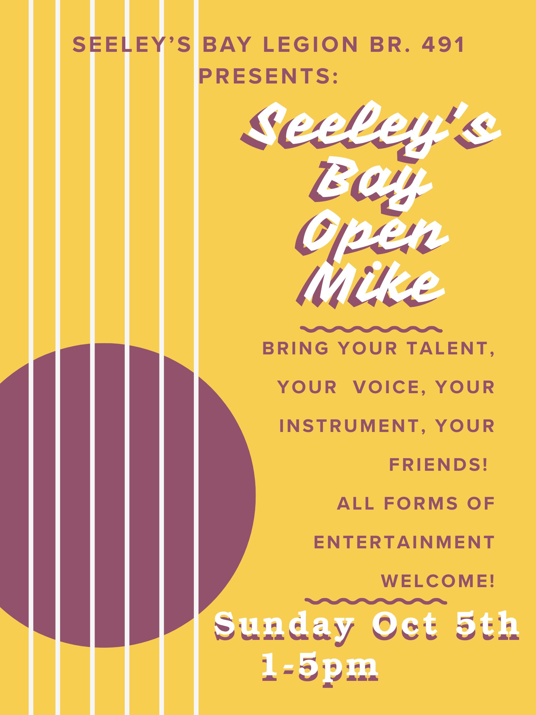 The Seeley's Bay Legion presents an Open Mike afternoon from 1-5pm on Sunday October 5th.